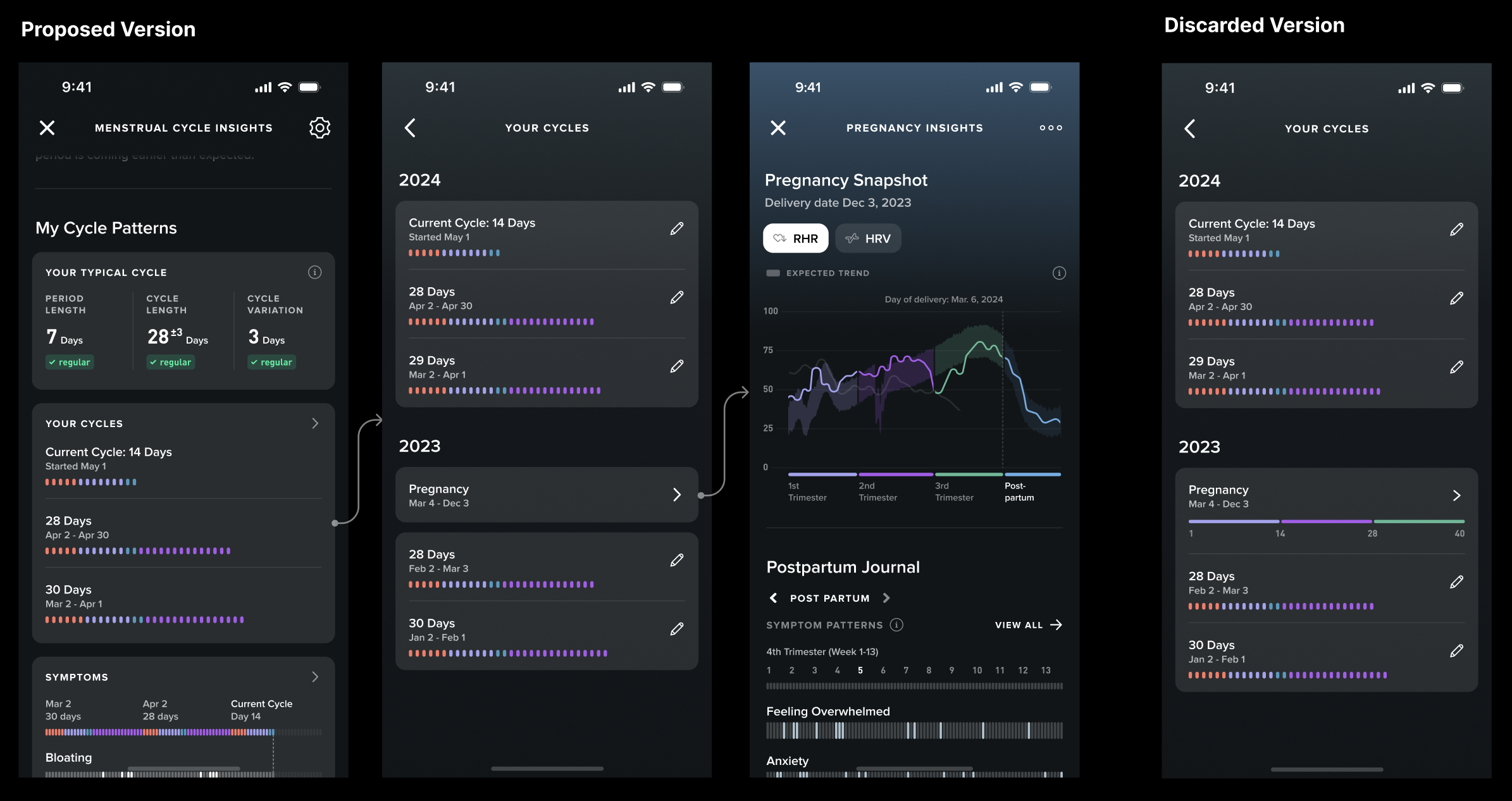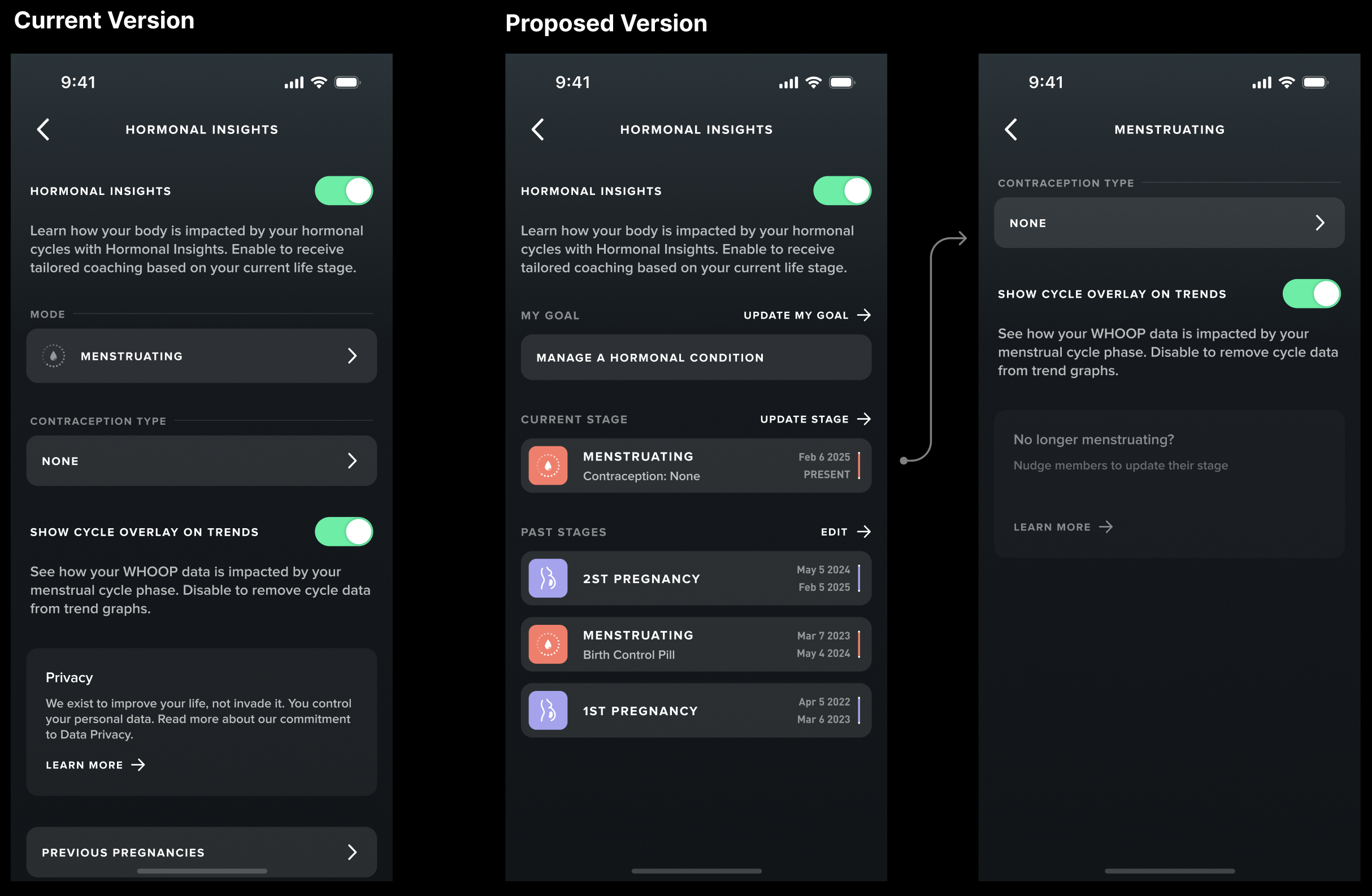 WHOOP Hormonal Insights is a new feature that has two modes: Menstrual Cycle Insights & Pregnancy Insights. However, they are treated as two separate modes in the app, which makes the experience not seamless and confusing. My task is to turn the experience from “switching modes” to “going through life stages”.